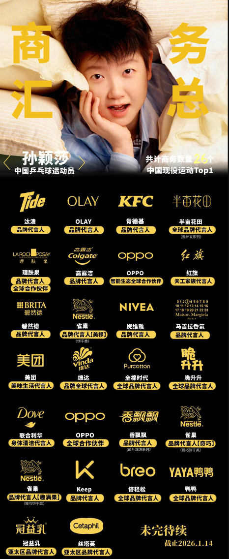 孙颖莎作为女单世界第一,她各种商务接到手软,她累计商务26个,她是现役运动员Top1,孙颖莎在新加坡大满贯的女单2000积分失效后依旧是积分破万。