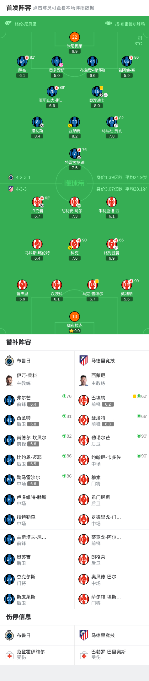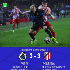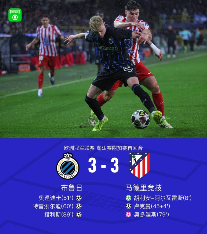 北京时间2月19日4:00,欧冠淘汰赛附加赛首回合,马德里竞技做客扬-布雷德尔球场挑战布鲁日,本场主裁判为格伦-尼贝里。上半场,阿尔瓦雷斯点射闪击,卢克曼再下一城。下半场,布鲁日凭借奥涅迪卡和特雷索尔迪的进球连扳两城追平,随后马竞依靠奥多涅斯的乌龙再度取得领先,措利斯绝平救主。最终,马竞客场3-3布鲁日。