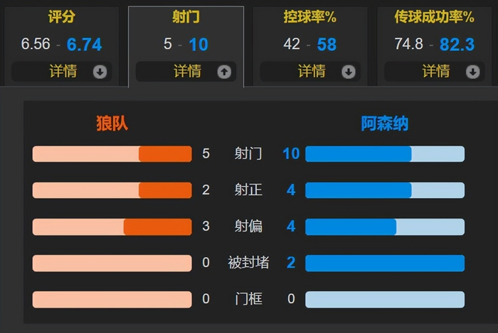 全场比赛,阿森纳的控球率为58%,一共有10次射门,其中4次射正;狼队一共有5次射门,其中2次射正。