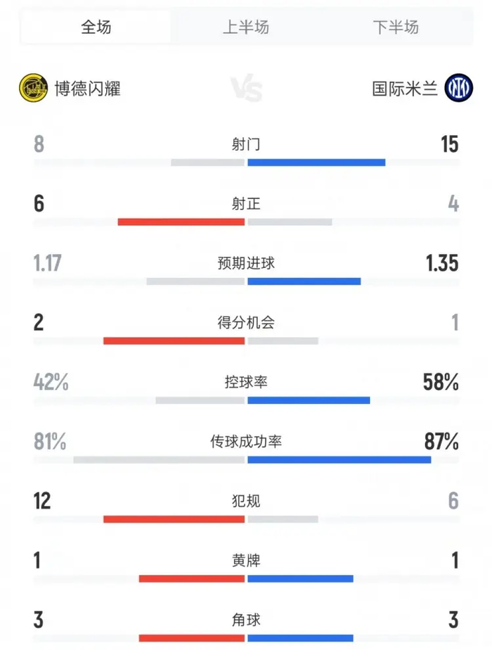 反观国米,全场比赛的表现堪称“离谱”。从数据上看,他们看似占据绝对优势:58%的控球率、15次射门,远超博德闪耀的42%控球和8次射门,但效率却低得令人发指——仅4次射正,只靠埃斯波西托的进球勉强挽回颜面。而博德闪耀则将“效率为王”发挥到极致,8次射门6次射正,3次洞穿国米球门,每一次反击都精准致命,让意甲豪门的后防线形同虚设。