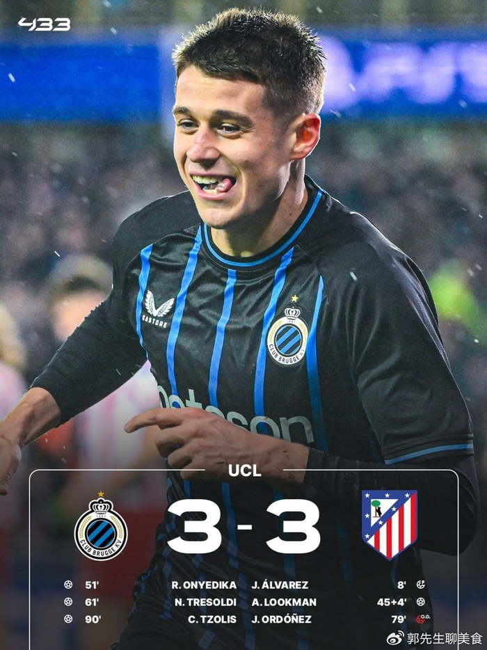 马竞客场3-3战平布鲁日,双方将于2月25日移师利雅得航空大都会球场进行次回合较量。阿尔瓦雷斯点射首开纪录,卢克曼扩大比分,格列兹曼助攻,奥涅迪卡和特雷索尔迪连入两球扳平,马科斯-略伦特造乌龙,佐利斯89分钟绝平。