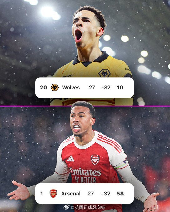 一、关键赛况与历史性突破 1. 赛事结果与进程:阿森纳上半场由萨卡头球首开记录,半场1-0领先(控球率68% vs 32%,射门7-2占优),但最终被狼队连扳两球追平。补时阶段狼队的绝平进球使其成为英超历史首支榜尾球队对榜首球队落后两球仍保持不败的队伍。 2. 积分影响:此役令阿森纳错失扩大领先优势的机会,仅以5分领跑积分榜,争冠悬念陡增。