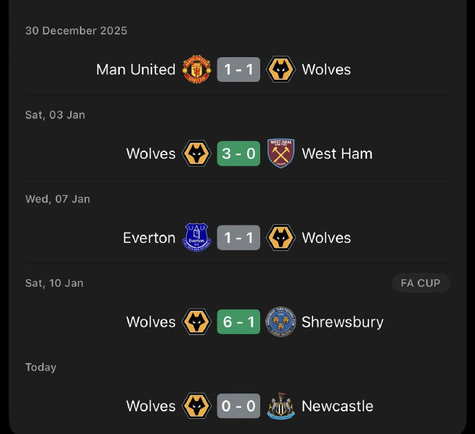 三、狼队韧性与战略价值 1. 保级关键1分:尽管全场处于劣势,狼队凭借顽强防守和高效反击拿到宝贵积分。赛前爱德华兹强调"需在无球时保持专注,关键时刻展现侵略性",战术部署得到完美执行。 2. 历史交锋延续:此役延续了狼队近期对强队的爆冷特质——2026年此前已战平曼联,打破了对阿森纳的英超9连败纪录。