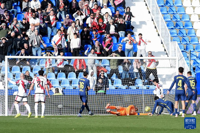 2月15日,巴列卡诺队球员诺贝尔·门迪(左二)在比赛中破门得分。