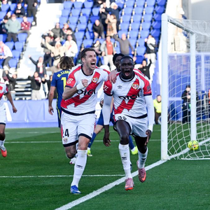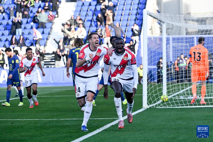 2月15日,巴列卡诺队球员诺贝尔·门迪(中)在比赛中庆祝进球。