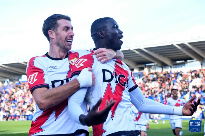 2月15日,巴列卡诺队球员诺贝尔·门迪(右)在比赛中与队友弗洛里安·勒戎庆祝进球。