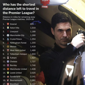 随着赛季关键阶段的临近,冠军之争愈发激烈——各支球队都在想方设法寻找哪怕是微小的优势。据The Athletic统计,阿森纳在剩余的客场比赛中需要行进的距离几乎只有曼城的一半,而且是所有英超球队中距离最短的。