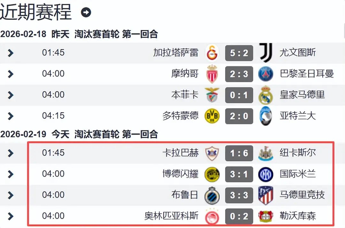 大年初三(2月19日)凌晨,欧冠淘汰赛附加赛首回合次日4场比赛全部结束。英超六队打进欧冠淘汰赛已成定局,意甲球队表现低迷,德甲球队整体发挥稳健,一夜之间连爆两大冷门!