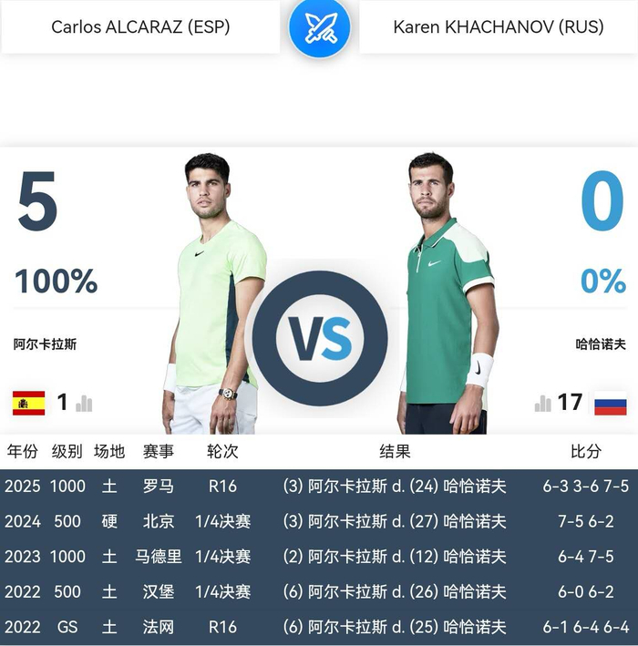 明天凌晨零点三十分,多哈站1/4决赛,阿尔卡拉斯迎来了俄罗斯雷神卡恰诺夫的挑战。这是两人职业生涯第六次交锋,彼此知根知底,不像职业生涯第一次交锋那么陌生,容易产生意外情况。不过,虽然阿尔卡拉斯此前五战全胜,又何敢轻敌疏忽,小心被雷神之锤当头棒喝呢!