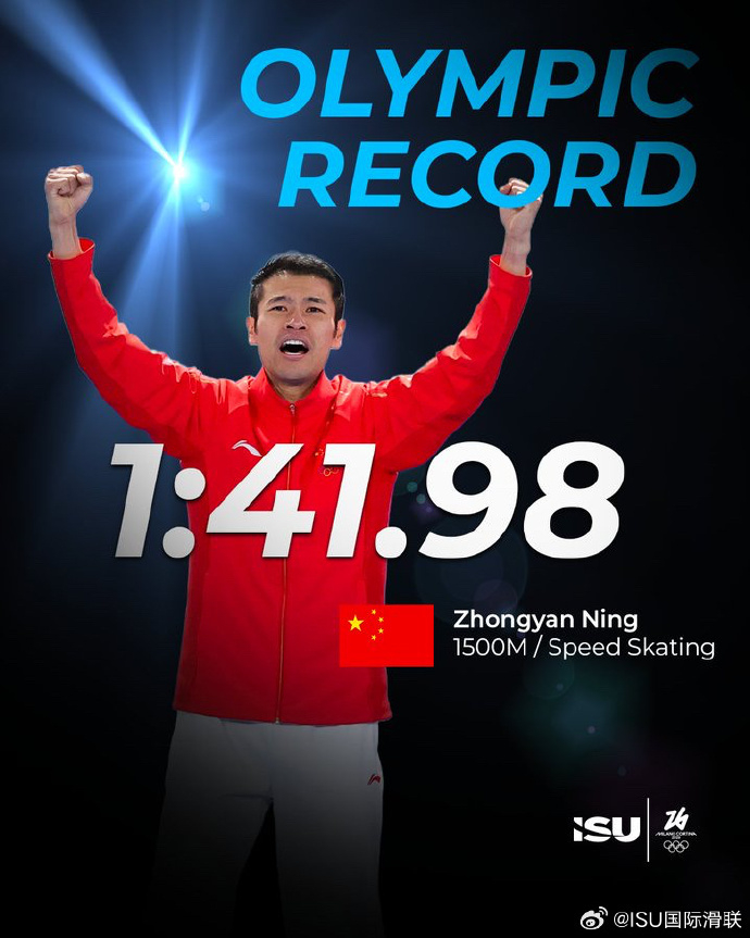 @ISU国际滑联 :“打破奥运纪录并夺冠!宁忠岩以1分41秒98的成绩完赛,将原奥运纪录提升超一秒⚡️ 这是真正的SHOWTIME!🔥”