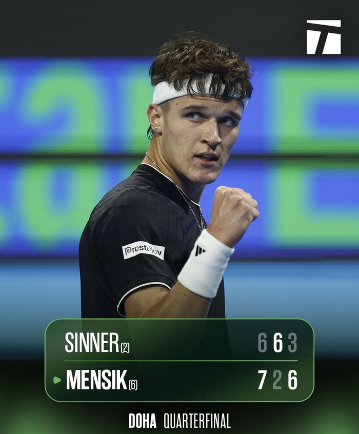 爆出冷门的一场四分之一决赛,是捷克小将门西克与现任世界第二辛纳的对决。这仅仅是两人的首次交手,结果却出乎所有人的意料:门西克以7-6(2)/2-6/6-3爆冷击败辛纳,强势挺进半决赛。