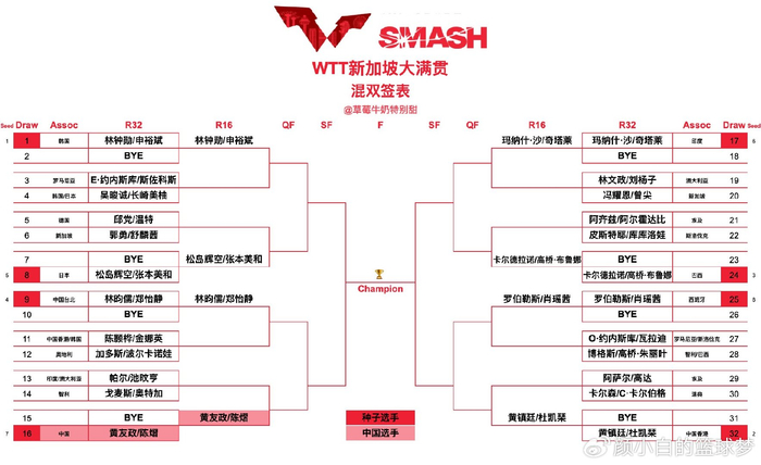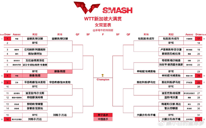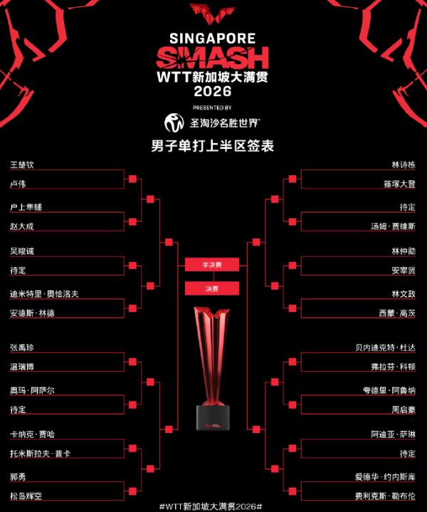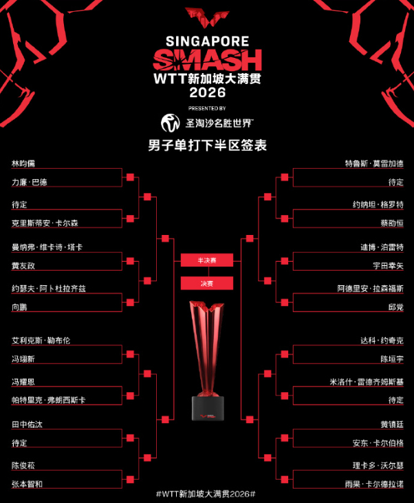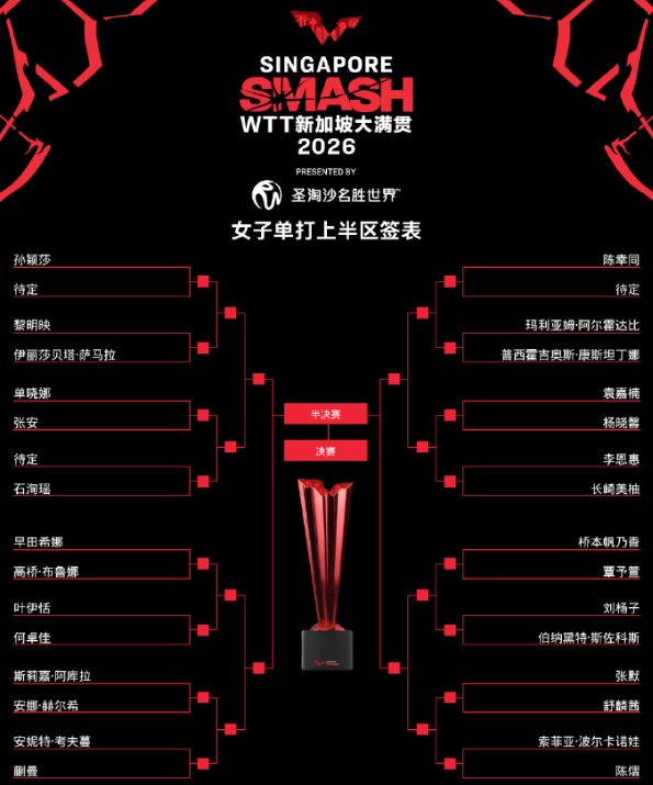 北京时间2月20日,WTT新加坡大满贯抽签仪式结束,男单、女单、女双、男双、混双五个项目的签表都出炉,不过因为资格赛还没打完所以一些单打球员首轮的对手还未确定。