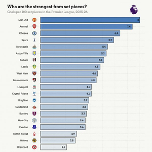 #曼城[超话]# TA统计了英超球队在定位球方面的数据,狼队在定位球防守的表现最好,利物浦最差,在定位球进攻方面,曼联排名第一,阿森纳次之。
