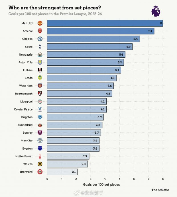 数据统计了各队每100个定位球的攻防数据,曼联每100个定位球能打入8球,高居英超第一,阿森纳7.4球第二,切尔西6.14球第三。