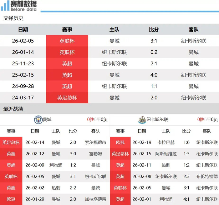 第一:两队情况!英超26轮战罢,曼城16胜5平5负积53分,落后先赛一场的阿森纳5分,加上剩余赛程曼城还有主场迎战阿森纳的比赛,因此曼城已经重新赢得争冠主动权;纽卡斯尔10胜6平10负积36分排名第十。上轮英超,曼城主场3-0大胜富勒姆,上周末足协杯2-0轻取索尔福德城晋级第5轮;纽卡斯尔客场2-1击败热刺,止住联赛三连败,上周末足总杯3-1淘汰阿斯顿维拉晋级第5轮,本周中欧冠1/8决赛附加赛首回合客场6-1横扫卡拉巴赫,纽卡斯尔取得各项赛事罕见的客场三连胜。