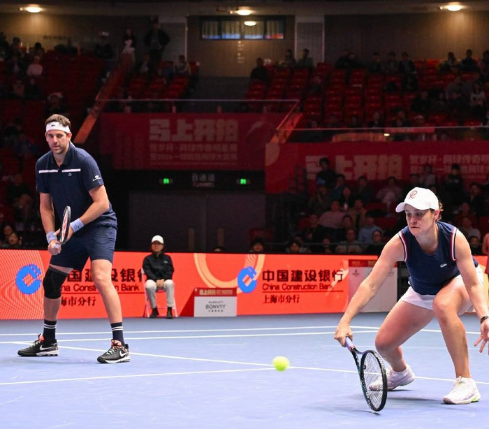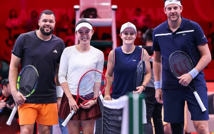 备受中国球迷喜爱的王蔷在混双表演赛中表现抢眼,面对昔日的“大师兄”德尔波特罗,王蔷展现出了极佳的手感。她多次在底线左右开弓,打出精彩的穿越球,让高大的阿根廷人望球兴叹。网友们在社交媒体上纷纷调侃: “大菠萝这膝盖真的拦不住”、“王蔷把大师兄调动得怀疑人生。” 尽管德尔波特罗的移动不如巅峰期迅捷,但他标志性的正手重炮和温暖的笑容,依然赢得了现场观众雷鸣般的掌声。