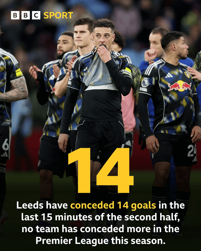 至此,利兹联本赛季英超已经在下半场的最后15分钟时间里丢掉14球。