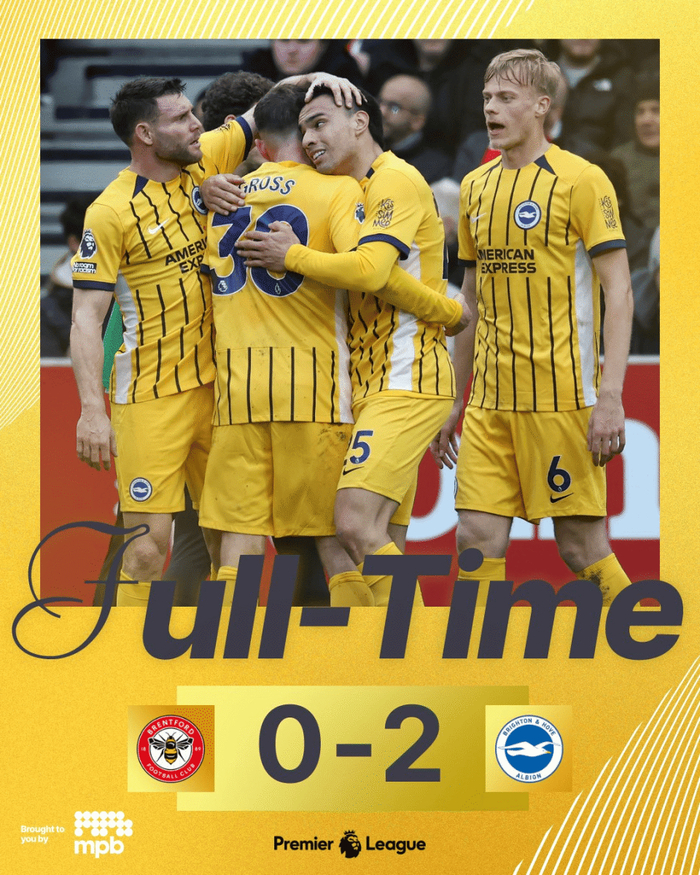 虎扑02月22日讯 在刚刚结束的一场英超第27轮的比赛中,布莱顿在客场2-0击败了布伦特福德。