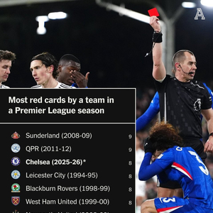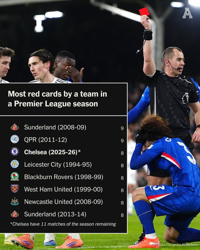 值得一提的是,这也是切尔西本赛季英超联赛中的第8张红牌,这使蓝军成为了英超联赛单赛季红牌并列最二多的球队,仅次于2008/09赛季桑德兰以及2011/12赛季女王公园的9张。