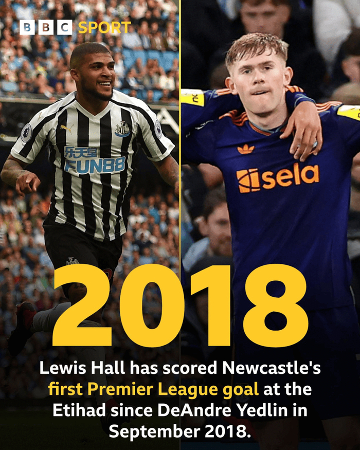 破荒,霍尔的进球是纽卡2018年来英超客场对曼城的首球