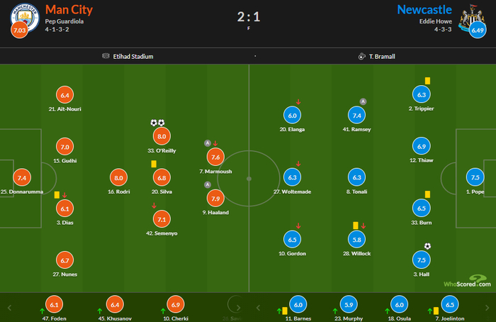 第90+2分钟,哈兰德和福登连续两脚打门,都被纽卡门将神勇挡出。