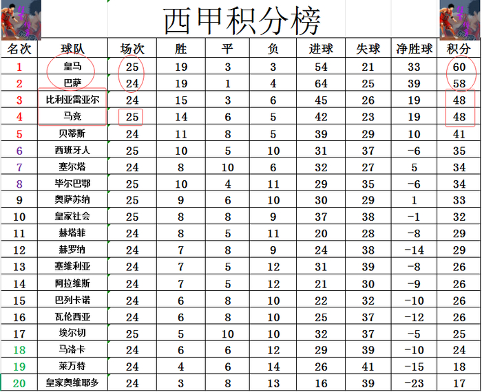 积分榜方面,皇马先赛输球,暂时还是2分优势力压巴萨领跑,只不过他们今天这一爆冷输球给巴萨反超机会,极可能让他们来个榜首一轮游,本轮巴萨只要拿下3分,就能1分优势超过皇马夺回榜首。此前3轮只拿到1分的马竞今天终于止住颓势,暂时追上比利亚雷亚尔,差榜首的皇马12分还是排在第4。