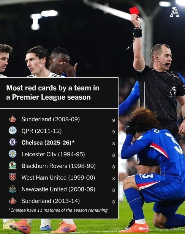 根据The Athletic统计,切尔西本赛季英超已经吃到8张红牌,在英超球队单赛季红牌榜上排名第三。