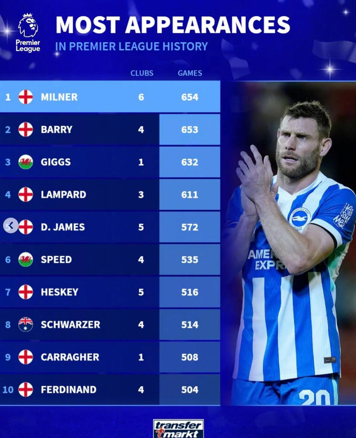 本轮英超第27轮,米尔纳首发出赛,使自己的英超出场数上升至654场,超越巴里的653场独占榜首。