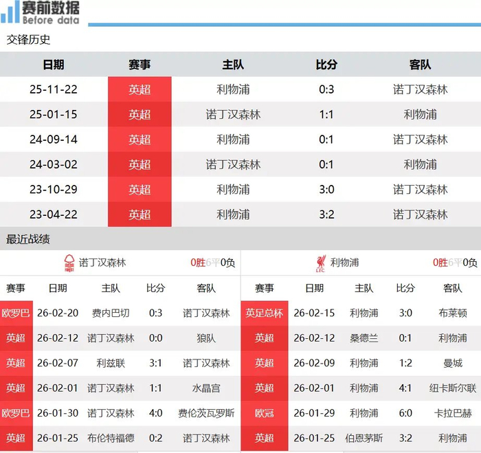 第一,两队近况。英超26轮战罢,诺丁汉森林7胜6平13负积27分,仅领先降级区2分;利物浦12胜6平8负积42分排名第六。上轮英超,诺丁汉森林主场0-0战平狼队,联赛三轮不胜,不过周中欧联杯附加赛客场3-0大胜费内巴切;利物浦客场1-0小胜桑德兰,上周末足总杯主场3-0击败布莱顿,顺利晋级第五轮。