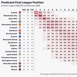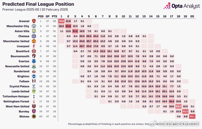 Opta预测北伦敦德比前英超夺冠概率,阿森纳76.64%领先 英国足球那点事 优质体育领域创作者 02.2221:42 关注 Opta在北伦敦德比前预测英超冠军概率🏆阿森纳:76.64%曼城:22.20%阿斯顿维拉:1.13%