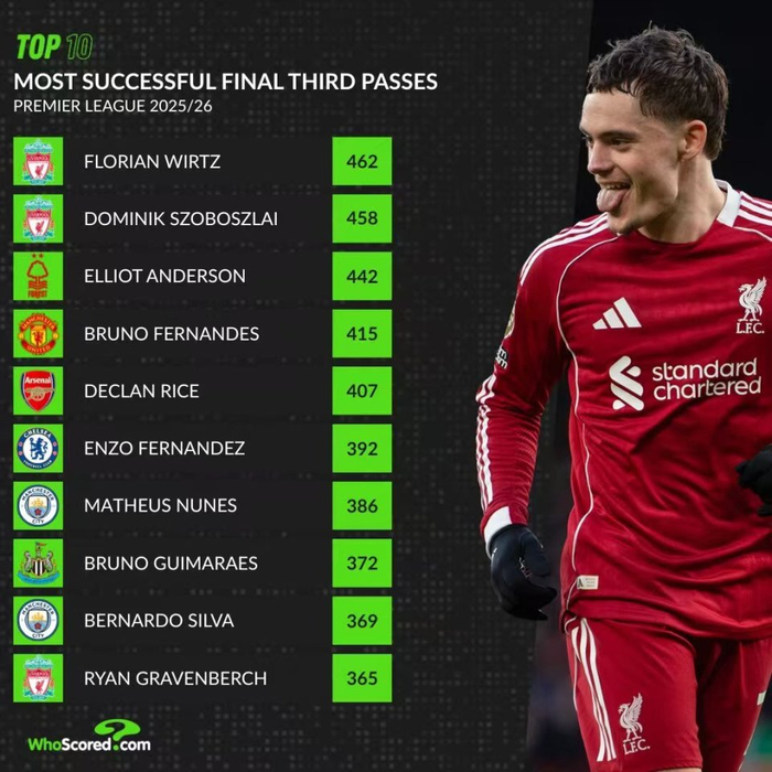 虎扑02月22日讯 据数据网站WhoScored统计,在2025/26赛季英超联赛中,弗洛里安-维尔茨以462次成功的进攻三区传球,高居英超榜首,成为本赛季在对方腹地最具创造力的球员。