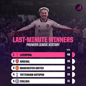 图表数据显示,在英超历史“补时制胜球”(90分钟或更晚)统计中,利物浦以48球排名第一,随后依次是阿森纳36球、曼联34球、托特纳姆热刺32球、切尔西31球。