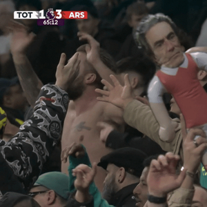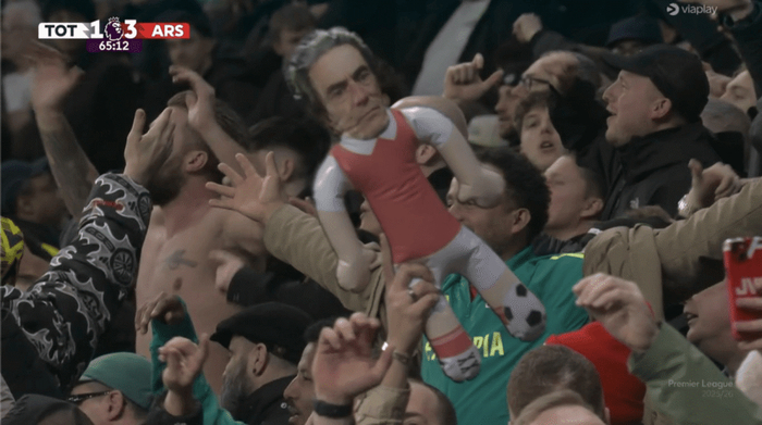 看台上,一位阿森纳球迷举起了一个印有热刺前任主帅弗兰克头像的玩偶。