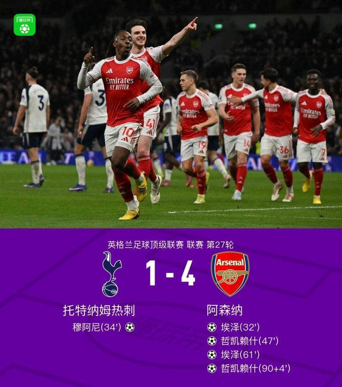 北京时间2月23日英格兰足球顶级联赛 联赛 第27轮,托特纳姆热刺主场对阵阿森纳。托特纳姆热刺穆阿尼破门。阿森纳埃泽梅开二度,哲凯赖什梅开二度。最终比分热刺 1-4 阿森纳。