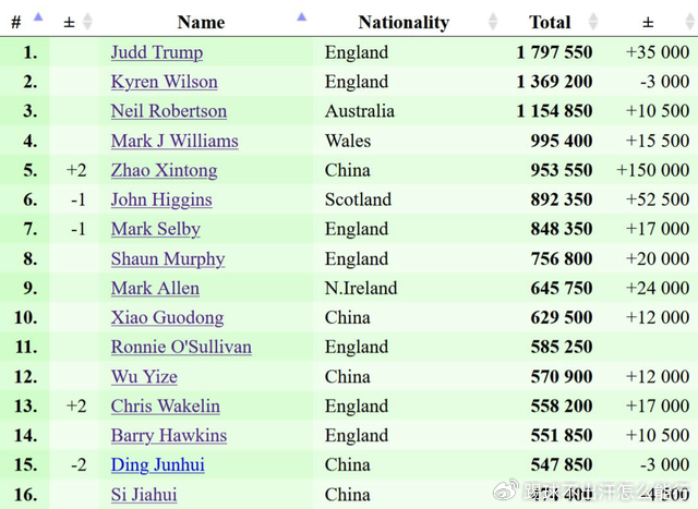 赵心童从解禁复出后,已经拿了4座冠军,排名也连续上涨。丁俊晖才38岁,需要加把劲了,状态如此低迷下去,将很快跌出前16。