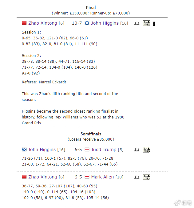 最终,赵心童与希金斯会师决赛,原本期待的赵心童与世界第一特鲁姆普的巅峰对决没有实现。值得一提的是,赵心童、希金斯在半决赛的进程都非常惊险,两人都是以6-5的比分险胜晋级决赛。