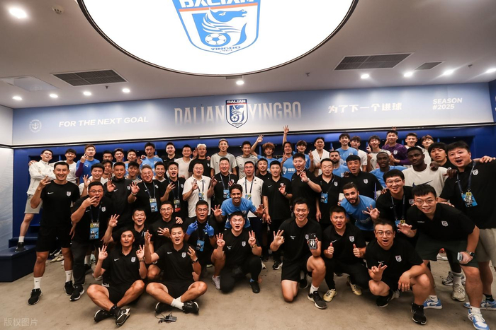 赛后,大连英博全体将士在更衣室合影庆祝。