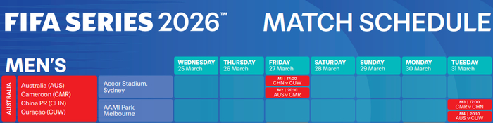 虎扑02月23日讯 国际足联官方公布了今年的FIFA系列赛具体赛程,其中包括中国男足3月份在澳大利亚的两场比赛。