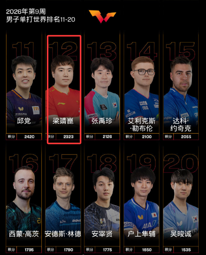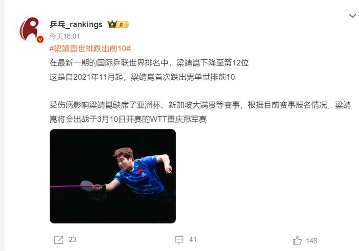 根据乒乓Rankings的报道,梁靖崑下降到世界排名12位,这是自2021年11月(11月15日)以来,梁靖崑首次跌出男单世界前十,也就是1560天。
