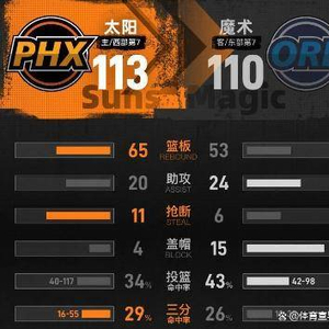 第三节,太阳队防守强度陡然提升。他们改用2-3联防,有效地限制了魔术队的突破,单节就造成了对手7次失误。进攻端,太阳队则是多点开花,在第三节中段打出了一波18比2的惊人攻击波,一举将比分从落后11分变成了反超5分。这一节,太阳全队轰下34分,而魔术只得到22分。三节战罢,太阳反而以77比73领先了4分。