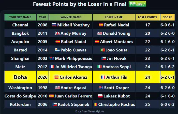 那么,自1990年ATP巡回赛建立以来,亚军决赛总得分最少的排名榜上,菲斯的24分能排到第几位呢?让我们看看历史榜单: