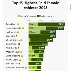 2025年女运动员收入榜公布:谷爱凌年入2300万美元排名第4,郑钦文年入2060万美元排名第5