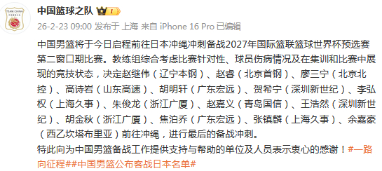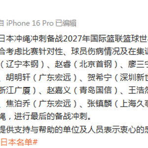 根据中国篮协官方的公示,中国男篮将于今日启程前往日本冲绳冲刺备战2027年国际篮联篮球世界杯预选赛第二窗口期比赛。教练组综合考虑比赛针对性、球员伤病情况及在集训和比赛中展现的竞技状态。