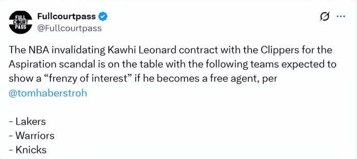 北京时间2月24日,据NBA记者汤姆-哈伯斯特罗报道,因此前涉及的阴阳合同问题,NBA有可能会宣布莱昂纳德与快船的合同无效。一旦莱昂纳德成为自由球员,预计湖人、勇士、尼克斯等球队会疯狂追求他。哈伯斯特罗在节目上的报道如下——