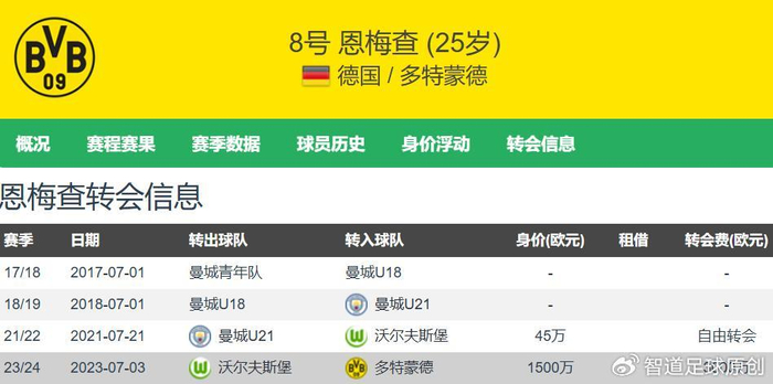 恩梅查出自曼城青训,球员于2021年夏窗自由转会加盟沃尔夫斯堡,2年之后,也就是2023年夏窗以3000万欧元的转会费转投多特蒙德,逐步成为大黄蜂中场核心、德国国脚。恩梅查算是多特蒙德重金签下培养的一位球星,卖给英超球队可以赚取更大差价。