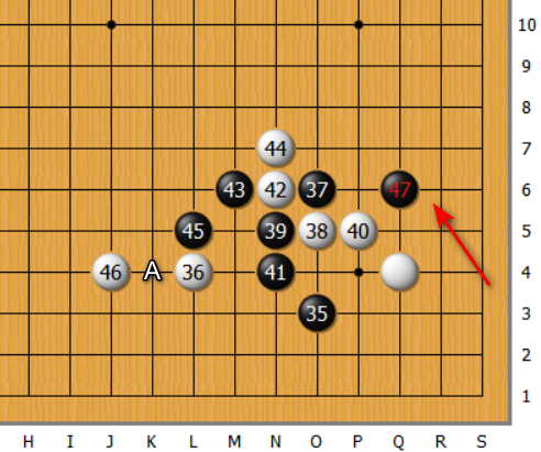 见上图,黑47跳,是莫名其妙的一手。细细回忆,这手棋是当年流行的招法,但现在看来,不知所云。取角空,还是取边地?这颗子最后莫名牺牲了!
