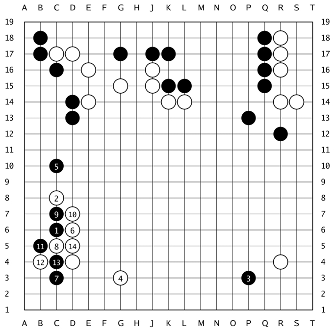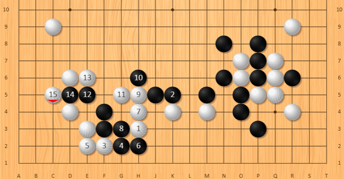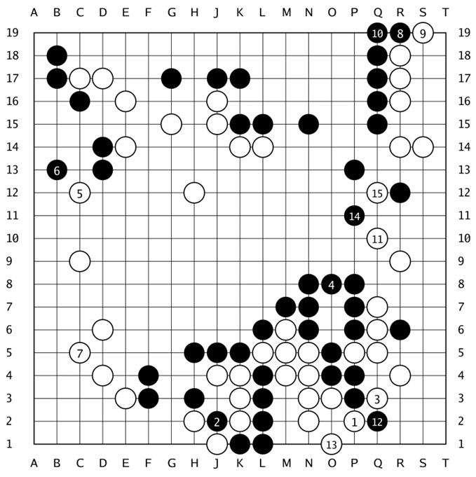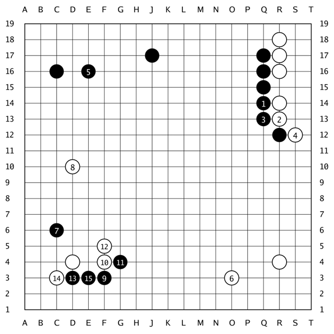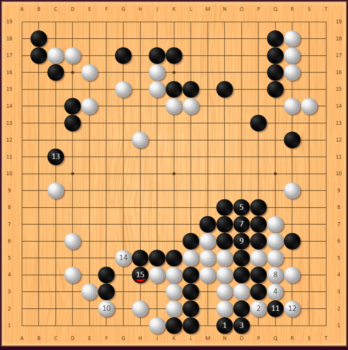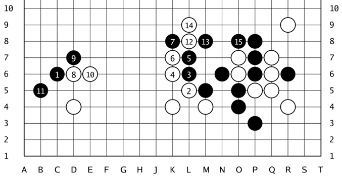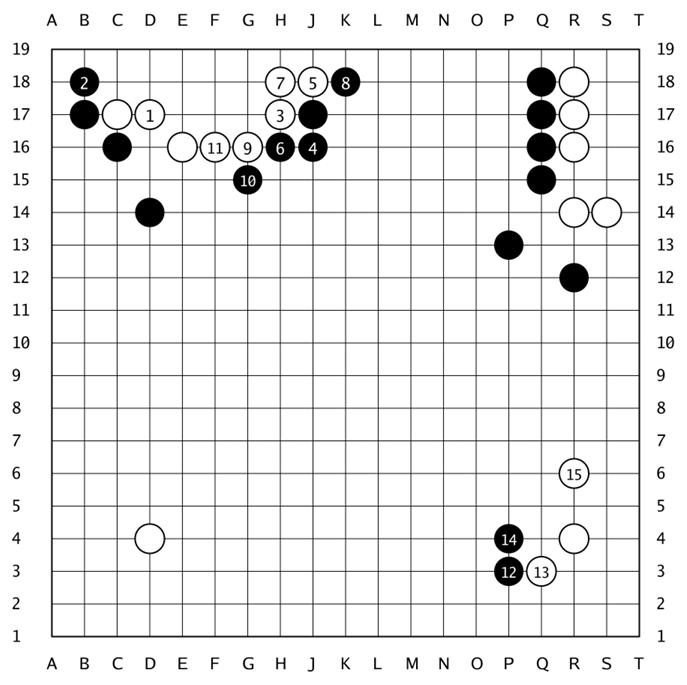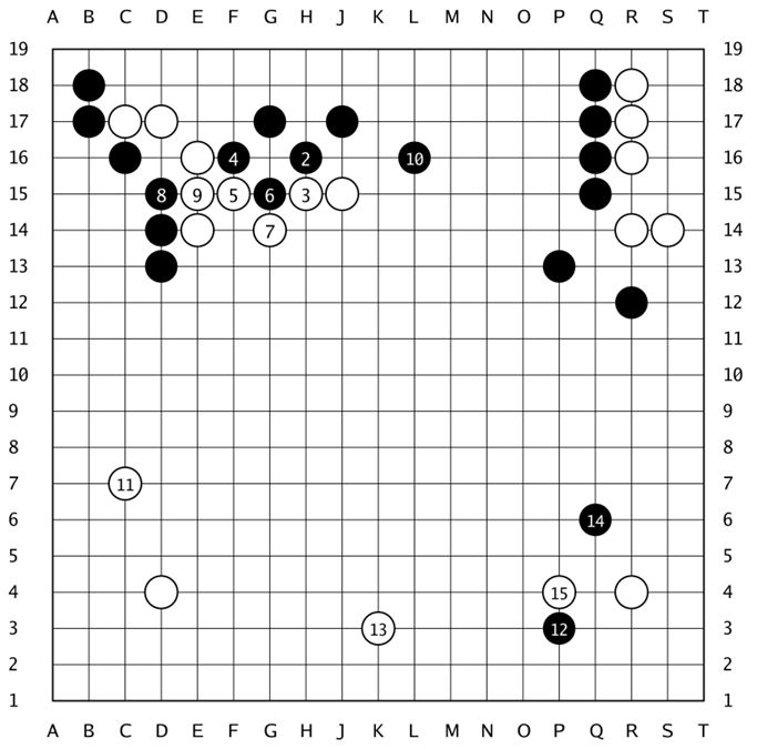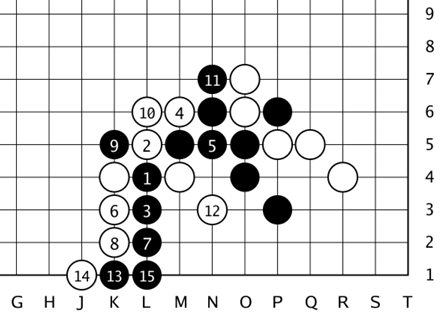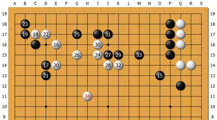见上图,黑棋以当时流行的“低中国流”开局,至黑15,完成“三·3”定式。