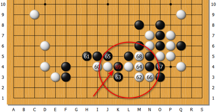 63刺,白在69接是本手。而黑白双方如“盲人”般视而不见,连续走出了64、65、66、67、68一串恶手!最终黑抢到69,将白棋切断。大型死活题横在棋手面前!