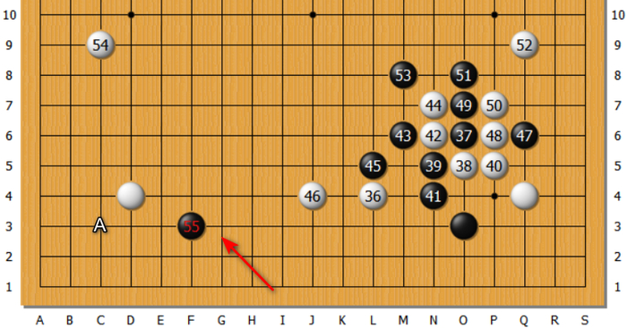 见上图,黑55挂角,不妥!应该在A位点角。