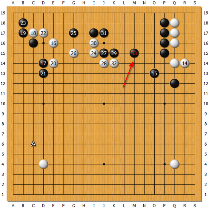 二、黑33跳,围边空见小。应该脱先,在A位挂角,见下图。